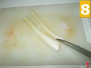 Lavate bene anche il sedano (7) e quindi tagliatelo in listelle (8), che poi triterete (9) finemente per metterlo su un piattino a parte.