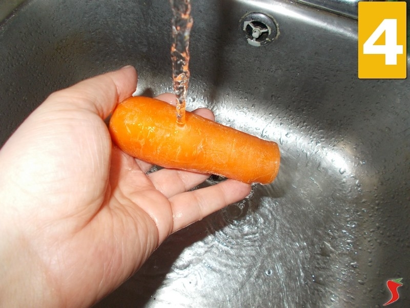 Lavate con cura la carota (4), e quindi tagliatela prima a bastoncini (5) e poi a cubetti (6) molto piccoli. Metteteli su un piattino a parte e proseguite.