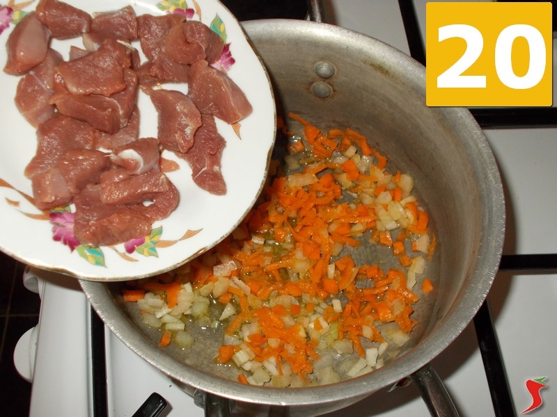 Date una mescolata (19) sommaria al trito e quando la cipolla diventa trasparente, aggiungete i cubetti di petto d'anatra (20) al soffritto. Fateli scottare e prendere colore, mescolando (21) di tanto in tanto.