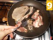 Lasciate cuocere a fiamma moderata per circa venti minuti ed aggiungetevi il rosmarino fresco (7). Una volta che la carne soffrigge, sfumate con una parte del vino bianco che avete a disposizione (8) alzando un po la fiamma, dopo con l'aiuto di una forchetta, girate la carne nell'altro lato (9) ed abbassate il fornello.