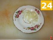 Il giorno seguente, trascorse 24 ore di marinatura, potrete iniziare la ricetta per cuocere il cervo. Per prima cosa prendete la metà della cipolla avanzata dal giorno prima e mettetela sul tagliere (22), così da poterla tritare finemente (23), e mettere tutto a parte (24) in un piattino.