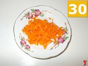 Infine, prendete l'altra carota e sbucciatela (28), con il pelapatate. Quindi prendete un grattaverdure e grattatela bene (29), per poi mettere anche la carota grattugiata su un piattino (30) a parte.