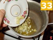 Ora prendete una pentola grande, meglio se di terracotta, e versateci dentro sei cucchiai di olio extravergine di oliva (31) a scaldare a fuoco medio. Una volta caldo aggiungete a soffriggere la cipolla tritata (32), e quindi anche il sedano a pezzi (33), e proseguite.