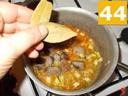 Tornate sul soffritto, date una mescolata (40) per controllare che sia ben insaporito e aggiungetevi dentro un pochino di acqua calda (41). Lasciate andare qualche minuto e quindi aggiungete i bocconcini di cervo (42) in cottura nell'olio.