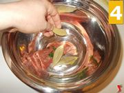 Per prima cosa, dovrete marinare la carne per circa 24 ore. Iniziate dunque la ricetta il giorno precedente, velocemente, mettendo la carne intera dentro ad una planetaria (1). Quindi iniziate ad aggiungere gli ingredienti, a partire dai chiodi di garofano (2) e dal prezzemolo (3).