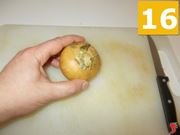 Ora prendete la cipolla e mettetela sul tagliere (16) per sbucciarla. Quindi tagliatene una metà, per usarla ora, mentre il resto vi servirà all'indomani. Tagliate una metà a pezzi grandi (17), e mettetela nella marinatura (18) insieme al resto degli ingredienti.