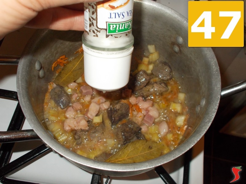 Mescolate bene (46) per far sciogliere il grasso nell'olio e insaporire la carne e lasciate andare la cottura per 15 minuti. Quindi salate leggermente (47) la carne, senza esagerare perché il guanciale è già salato, e quindi coprite con un coperchio (48) per far andare la cottura per altri 15 minuti.