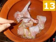 Ora unite nella casseruola con l'olio di oliva uno spicchio di aglio intero senza buccia (7), lasciate soffriggere ed aggiungete le parti di coniglio (8), proseguite aggiustando di sale fino a vostro gradimento (9).