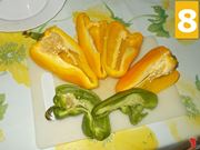Mentre il coniglio viene rosolato iniziate a lavare bene i peperoni (7) sotto l'acqua corrente e quindi divideteli in due per eliminare le parti vegetali, i semi interni e le parti bianche (8). Quindi tagliateli a listelle (9) e metteteli da parte in una ciotolina.