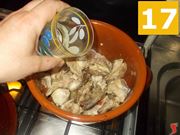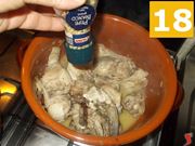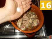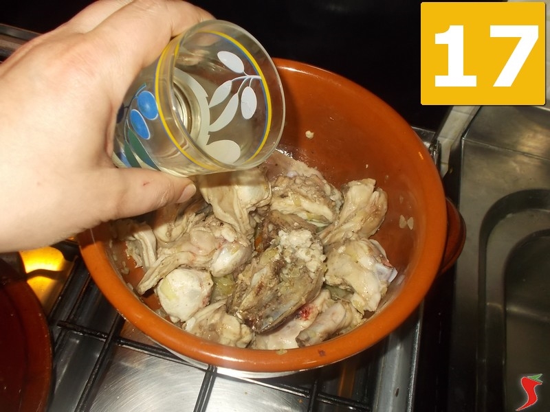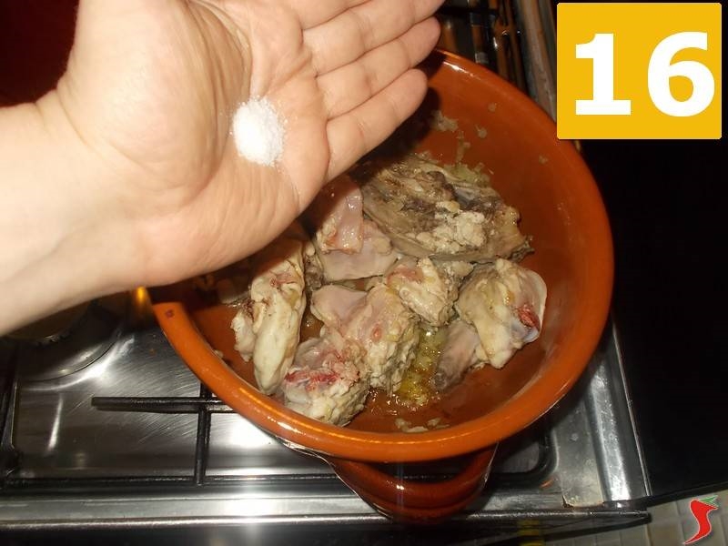 Una volta rosolato il coniglio abbassate leggermente la fiamma e quindi salate (16) a vostro piacere. Quindi aggiungete il vino (17) per farlo sfumare lentamente e pepate (18) con una spolverata di pepe bianco macinato fresco. Coprite con un coperchio e lasciate andare la cottura che deve essere di 40 minuti totali.