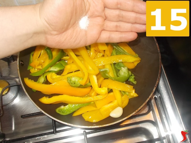 Una volta dorato l'aglio unite alla padella anche i peperoni (13) e fateli scottare (14) qualche minuto a fiamma viva prima di abbassare il fuoco a fiamma media e salare (15). Lasciate andare con il coperchio una decina di minuti.