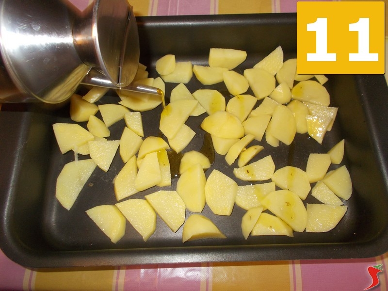 Prendete ora una teglia rettangolare di grande dimensione e ponete al suo interno le patate lavorate in precedenza (10), dopo condite con olio extravergine di oliva a vostro gradimento (11), e sale fino (12).