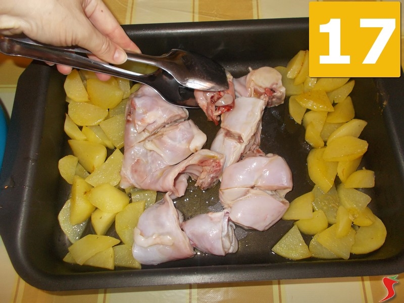 Terminata la prima cottura, togliete la teglia dal forno e con un mestolo fate spazio distribuendo le patate ai lati del contenitore (16), dopo con una pinza, ponete il coniglio marinato nella teglia (17) e con un cucchiaio oppure un mestolo da brodo, aggiungete sopra una parte del condimento della marinatura (18). Infornate nuovamente a 150 gradi per circa un'ora, girando di tanto in tanto le patate ed anche la carne. Terminata la cottura, togliete dal forno ed impiattate, servendo la pietanza ben calda. Potete accompagnare la carne con del buon vino rosso giovane dai sapori fruttati.
