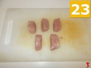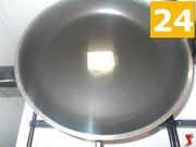 Ora con un coltello dalla lama lunga e liscia tagliatelo a fette dello spessore di due centimetri circa (22) ed una volta terminato questo passaggio, lasciate la carne da parte sopra il tagliere (23). A questo punto, fate sciogliere a fiamma bassa un po del burro che avete messo da parte, in una padella antiaderente (24).