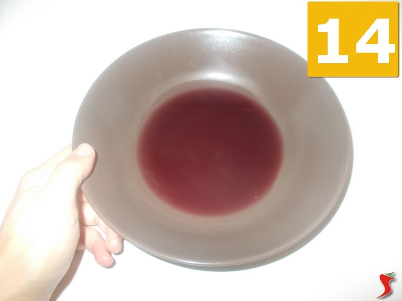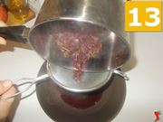 Una volta pronta la salsa, filtratela con un colino dalla trama fitta (13) e dopo lasciate da parte la salsa al vino rosso dentro un piatto fondo da portata (14) . Nel frattempo dopo aver posto le mele che vi occorrono sopra un tagliere, sbucciatele finemente con un pelapatate (15).