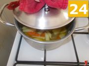 Adesso aggiungete nella pentola il sedano a pezzettini (19), e le patate a bastoncini scolate in precedenza (20), poi aggiungete un mestolo abbondante di brodo vegetale che avete preparato all'inizio della ricetta (21). Coprite con un coperchio e lasciate cuocere a fiamma moderata per circa quindici minuti.