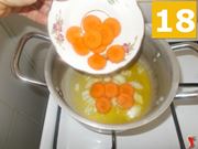 Versate in una pentola di medie dimensioni quattro cucchiai di olio extra vergine di oliva (16) ed unitevi la cipolla precedentemente sminuzzata (17), e la carota tagliata a rondelle (18).