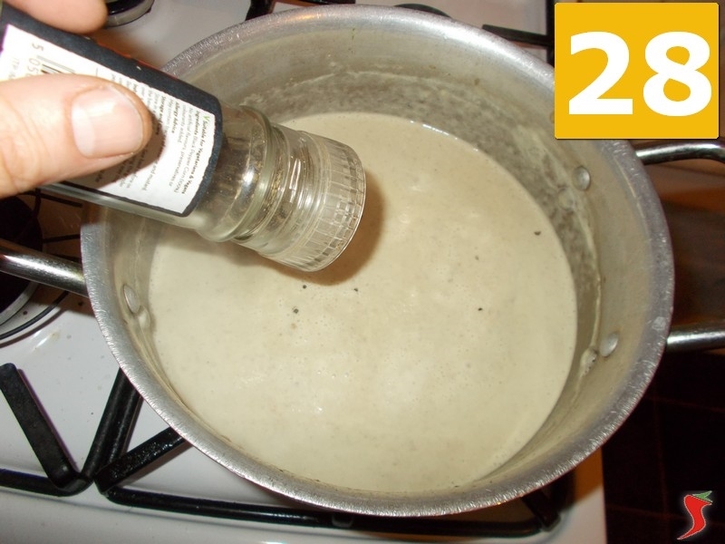 Fate leggermente stiepidire i funghi, e poi, con il minipimer, frullate tutto (25), riducendo tutto ad una crema. Rimettete la pentola sul fuoco per far riscaldare di nuovo, e aggiungete la panna (26) da cucina, mescolandola bene (27) con il cucchiaio per amalgamare il tutto.