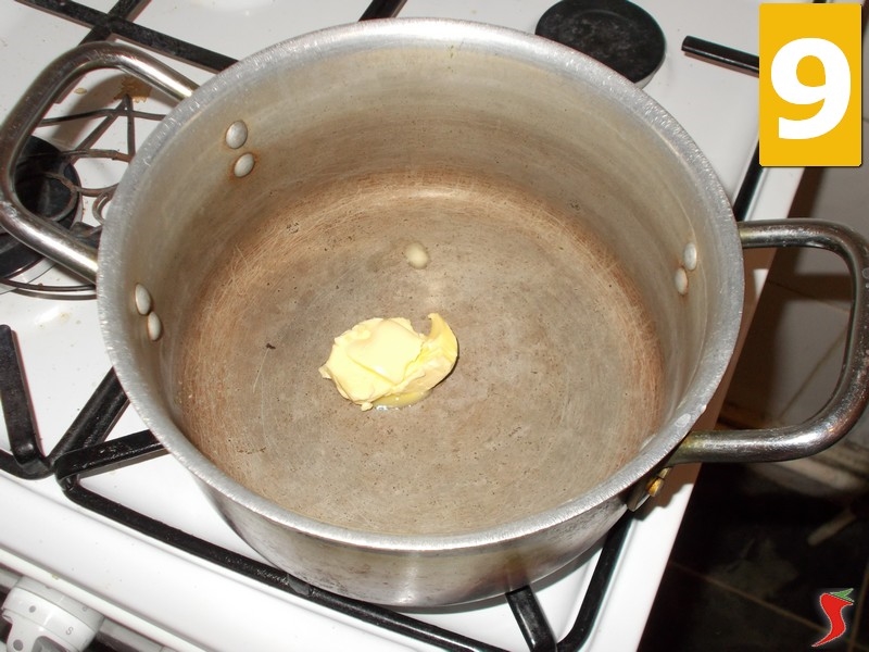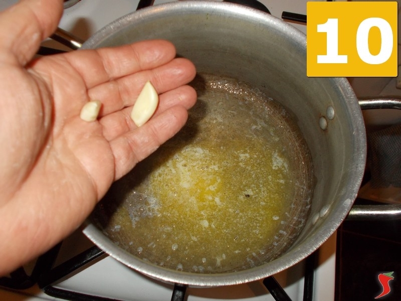 Mettete i cubetti di patate in una ciotolina (7) a parte, e quindi sbucciate lo spicchio d'aglio (8). Poi mettete a fondere il burro (9) in un tegame grande.
