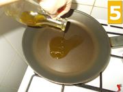 Quindi iniziate a preparare un soffritto leggero. Sbucciate e tritate finemente gli spicchi d'aglio (4). Poi versate cinque cucchiai di olio extravergine di oliva (5) in una padella ampia ed antiaderente e fateli scaldare a fuoco medio e una volta caldo unitevi anche l'aglio tritato (6) a soffriggere fino a farlo dorare.