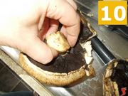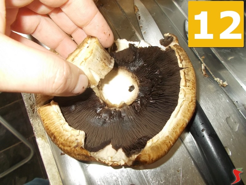 Il gambo, nei funghi molto grandi magari da cucinare trifolati, andrebbe tolto e cucinato separato. Per staccare il gambo prendetelo tra pollice e indice (10), quindi iniziate a rotearlo leggermente (11) ampliando il movimento fino a staccarlo (12) delicatamente del tutto. Quindi pulite il gambo utilizzando gli stessi metodi che avete usato per il cappello.