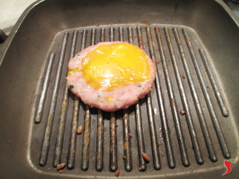 Iniziamo la ricetta prendendo gli hamburger e facendovi una fossetta al centro di ognuno di essi premendo con l'aiuto di un cucchiaio. Prendete un pennello e spennellate gli hamburger con dell'olio, dopo di che scaldate una piastra e quando questa è ben calda mettete gli hamburger a cuocere. Cuocete 10 minuti girandoli una sola volta. Nel frattempo dividete tuorli dagli albumi e mettete gli albumi a cuocere al centro della fossetta degli hamburger. Dopo 5-6 minuti mettete anche i tuorli a cuocere nella fossetta e arricchite con sale e pepe. Cucinate per 3-4 minuti finchè anche il tuorlo non si è rassodato, dopo di che servite l'hamburger su una base di insalata ed impiattate.