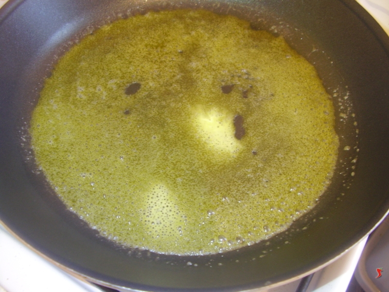 Ora prendete una padella antiaderente ampia e ponete tutto il burro a sciogliere a fiamma media. Quando il burro è tutto fuso e sta friggendo posatevi sopra i petti di pollo e iniziate a farli rosolare su un lato per circa quattro minuti.