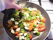 Una volta sfumato il vino aggiungete le verdure e salate leggermente. Mescolate bene e poi sfumate ancora del vino. Mettete il coperchio e lasciate cuocere per circa 15, 20 minuti.