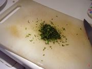 Prendete tutte le erbe, rosmarino, timo, basilico e prezzemolo, e iniziate a tritare il tutto. Quindi prendete il petto di pollo e impanatelo con il trito di erbe.