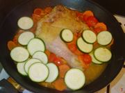 Il pollo con le verdure prevede una ricetta semplice ma ricca di ingredienti, per un tempo di preparazione un pochino più lungo del solito. Per una ricetta da due persone procuratevi dunque:2 cosce di pollo1 zucchina1 carota6 pomodori pachino1 cipolla1 costa di sedano10 cl di brodo vegetale10 cl di vino bianco10 g di farina1 rametto di rosmarino20 g di burroolio extravergine d'olivapepe nero quanto basta