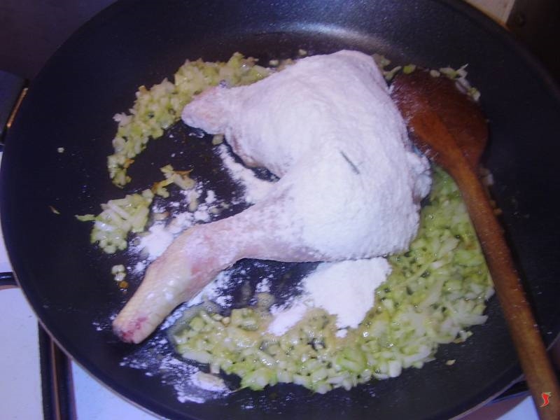 Accendete il gas sotto alla padella e fate sciogliere il burro, quindi una volta sciolto mettete la cipolla con il sedano a soffriggere a fiamma media. Intanto infarinate bene il pollo su tutti i lati.
