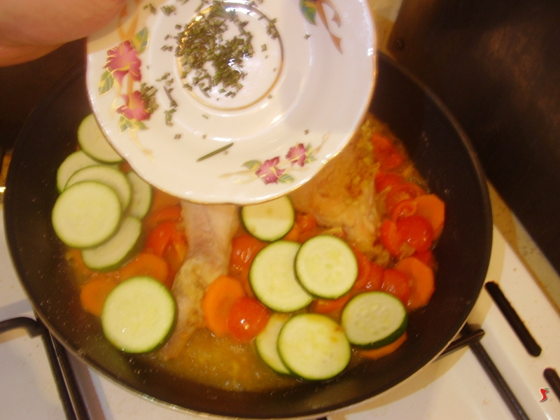 Ora tritate bene le foglie di rosmarino e aggiungetele al pollo. Quindi aggiungete anche una spolverata di pepe nero macinato fresco e salate a vostro gradimento. Lasciate andare per circa una mezzora prima di controllare se il pollo sia cotto. Mantenete sempre il coperchio, aggiungendo il brodo di tanto in tanto se il sughetto si asciuga troppo. Come pronto impiattate un coscio a persona coprendolo con le verdure.