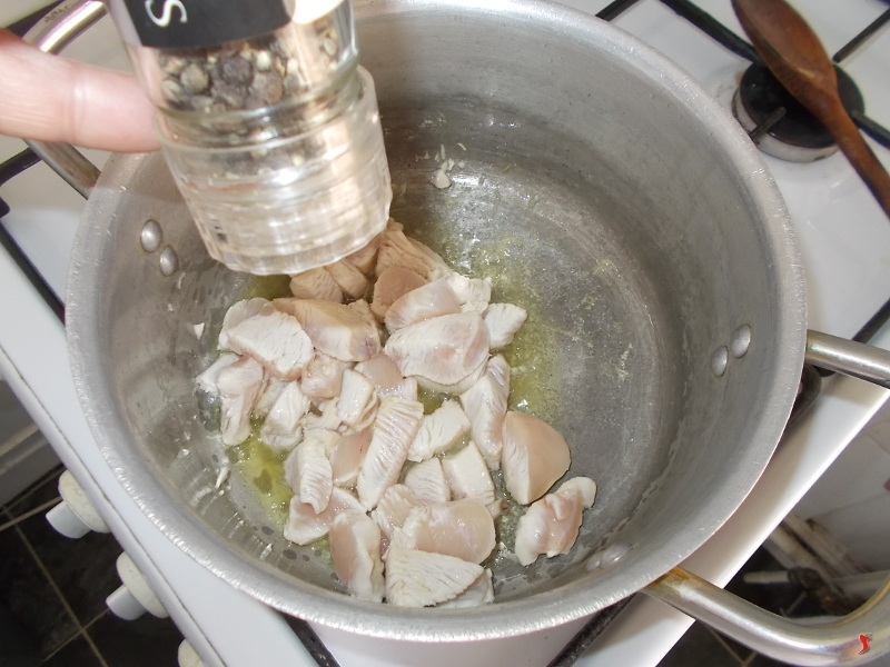 Una volta che l'olio si è scaldato aggiungetevi i dadini di pollo e iniziate a rosolarli bene finché non prendono colore in tutte le parti, quindi per circa cinque minuti. Quindi salateli leggermente e spolverateli con del pepe nero fresco appena macinato.