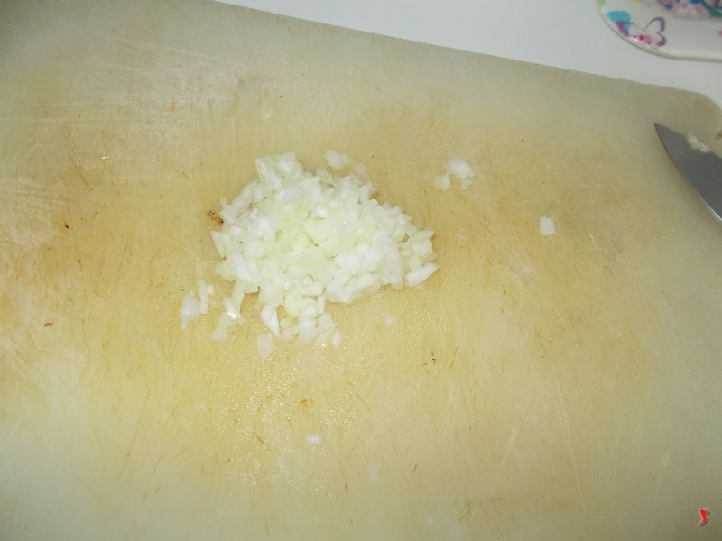 Dopo cinque minuti, quando avrete ben rosolato il pollo, toglietelo con un cucchiaio forato per metterlo a parte e tenete l'olio nel tegame, dove metterete immediatamente la cipolla e l'aglio tritate per farle soffriggere leggermente.