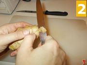 La ricetta va cominciata alcune ore prima per preparare la marinatura nella quale immergere i cosciotti di pollo ad insaporire. Quindi prendete una planetaria e iniziate a preparare gli ingredienti per la marinatura, tritando grossolanamente la cipolla (1). Quindi sbucciate lo zenzero (2) e grattatelo sulla grattugia (3).