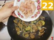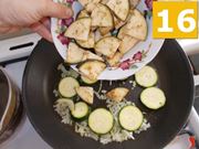 Una volta scaldato l'olio unitevi anche la cipolla (13) e quindi fatela soffriggere fino a farla divenire trasparente. Poi unite anche le zucchine (14) e fatele insaporire (15) qualche minuto.