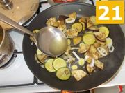 Continuate la cottura delle verdure, aggiustando di sale (19), pepando (20) a vostro piacere con del pepe nero macinato fresco e quindi aggiungete un mestolo o due di brodo vegetale (21) ben caldo.