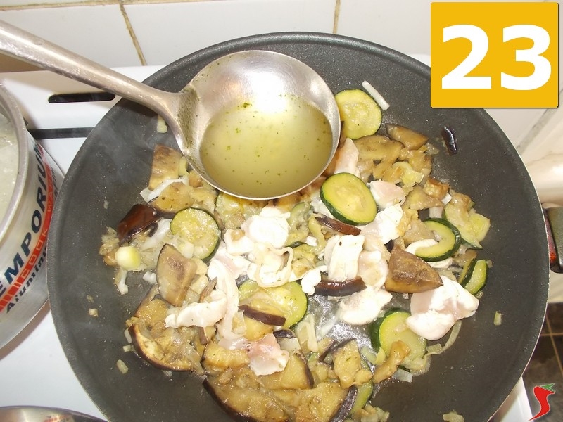 Dopo aver insaporito le verdure per dieci minuti, unite alla padella anche i bocconcini di pollo (22) e continuate la cottura aggiungendo ancora un mestolo o due di brodo caldo (23) per altri 10 minuti. Nel frattempo mettete a cuocere il riso (24) per il tempo indicato in confezione.