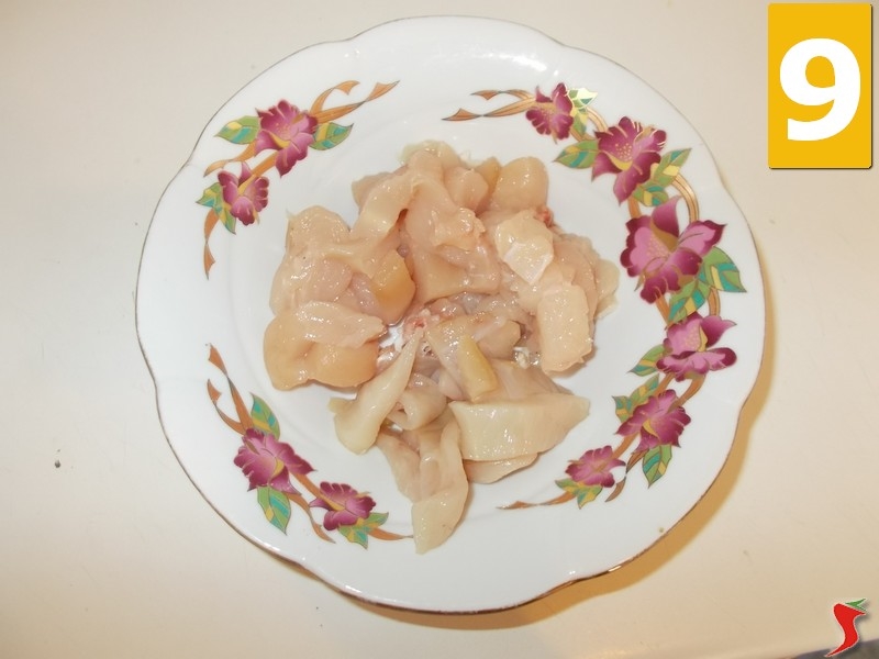 Ora mettetevi a lavorare sul petto di pollo, ponendolo sul tagliere. Con il coltello grande da carne iniziate a tagliare a dadini (7) il primo petto e quindi eseguite la stessa operazione sul secondo petto (8). Infine mettete tutti i dadini in un piattino (9) a parte.