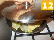 A questo punto aggiustate di sale fino a vostro gradimento (10), mescolate accuratamente con un cucchiaio facendo attenzione a non graffiare il fondo della padella (11) e coprite con un coperchio lasciando cuocere per circa venti minuti a fiamma moderata (12).