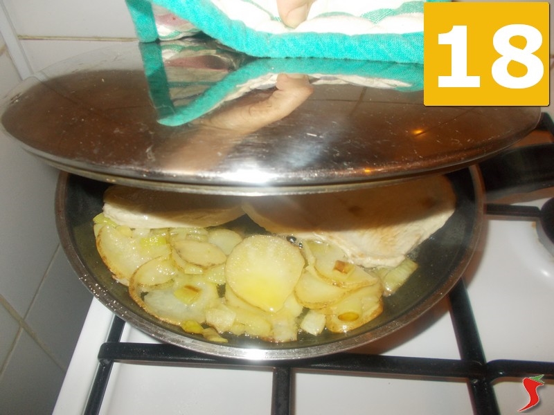 Adesso coprite la padella con tutti gli ingredienti con un coperchio (16) e lasciate cuocere a fiamma moderata per circa dieci minuti, dopodiché togliete il coperchio e con una forchetta girate la carne nell'altro lato (17), aggiustate ancora di sale se lo ritenete necessario e coprite nuovamente con il coperchio, lasciando cuocere per altri dieci minuti a fiamma moderata (18). Una volta pronta la ricetta, impiattatela e servitela in tavola ben calda, accompagnandola con del buon vino rosso dai sapori fruttati.