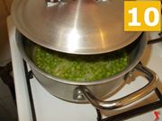 Ora coprite la casseruola con i piselli con un coperchio (10) e lasciateli cuocere per circa un quarto d'ora. Trascorso questo tempo unite anche il tacchino (11) a cuocere, mescolate bene e fatelo rosolare, quindi coprite con un coperchio (12) e continuate a far cuocere per altri quindici minuti, finché la carne non è cotta. Quindi spegnete il fuoco ed impiattate per servire subito in tavola ben caldo, con il macinino del pepe nero accanto per chi volesse ancora servirsene.