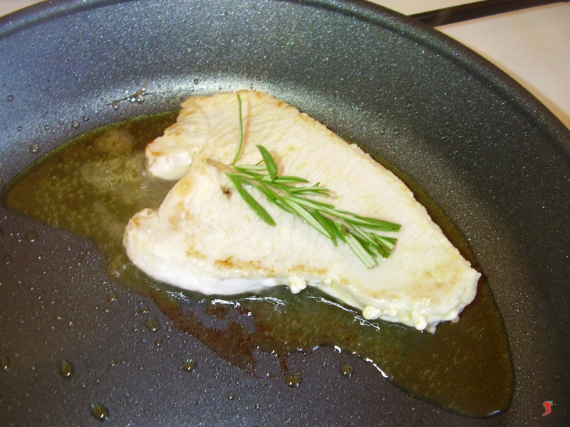Come l'aglio inizia a dorare e aromatizzare l'olio toglietelo e mettete il petto di tacchino sul fuoco. Fatelo rosolare bene cinque minuti per lato. Una volta girato sull'altro lato salatelo e ponete il rametto di rosmarino.