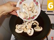 Adesso prendete una padella di medie dimensioni ed aggiungete sul fondo tre cucchiai abbondanti di olio extravergine di oliva (4), ed una volta ben caldo unitevi l'aglio intero con la camicia (5). Quando gli ingredienti inizieranno a soffriggere, abbassate la fiamma ed aggiungete i funghi champignon lavorati in precedenza (6).