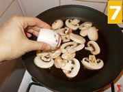 Ora prendete il sale fino ed aggiustate a vostro gradimento i funghi in padella (7), poi con un cucchiaio di legno mescolate accuratamente (8) e coprite con un coperchio, lasciando in cottura a fiamma moderata per circa venti minuti (9). Consigliamo di aggiungere un po di acqua oppure del vino bianco, nel caso si consumasse l'olio in padella.