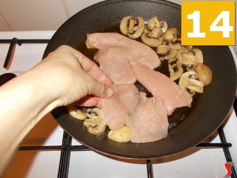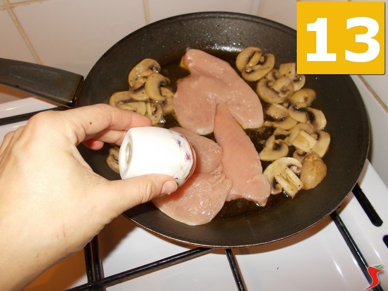 A questo punto aggiustate di sale fino anche la carne in padella (13) e lasciate cuocere a fiamma moderata per circa dieci minuti (14). Terminato il tempo di cottura, con una ramina oppure con una schiumarola, girate i petti di tacchino nell'altro lato e lasciate cuocere ancora per altri dieci minuti (15). Una volta pronta la carne, impiattate e servitela in tavola ben calda, accompagnandola con del buon vino rosso giovane dai sapori fruttati e per chi volesse servirsene, potete portare anche del pane fresco appena riscaldato.
