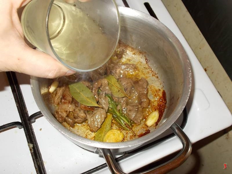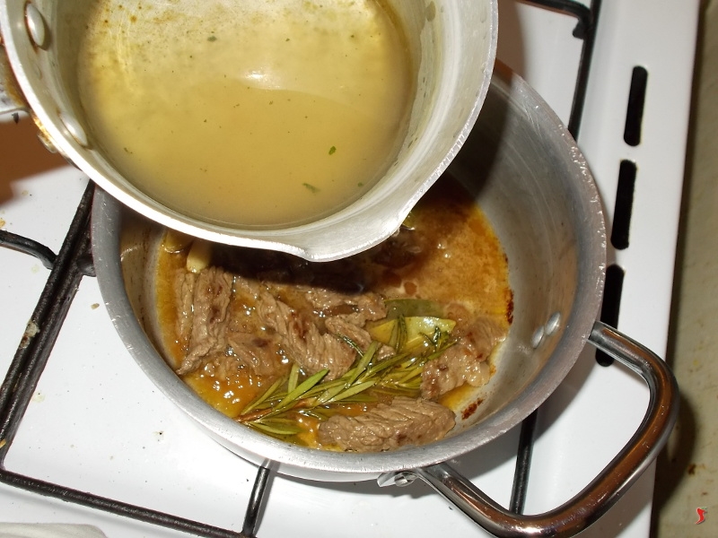 Appena l'aceto è sfumato del tutto iniziate ad aggiungere il vino, versandolo tutto sulla carne e iniziando ad aromatizzarla con il vino. Lasciate andare la cottura solo in vino per circa 10 minuti, anche un quarto d'ora, e poi aggiungete il brodo fino a coprire tutta la carne.