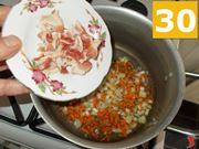 Aggiungete al tegame anche la carota grattugiata (28), il sedano tritato (29) e la pancetta a pezzi (30).