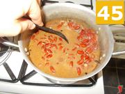 Date una mescolata sommaria (40) e quindi aggiungete anche la salsa di pomodoro (41), e mescolatela bene (42) per amalgamarla al resto degli ingredienti.