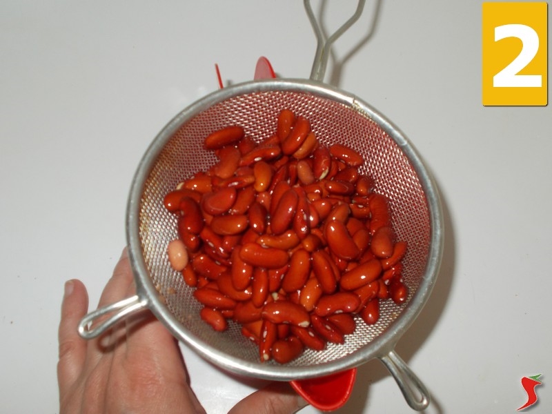 Iniziate la ricetta il giorno prima, mettendo a bagno i fagioli secchi (1). Il giorno seguente, dopo almeno 12 ore a bagno, sgocciolate i fagioli (2) in un setaccio, e poi cominciate la ricetta. Versate cinque cucchiai di olio extravergine di oliva (3) in un tegame grande e lasciate a parte.